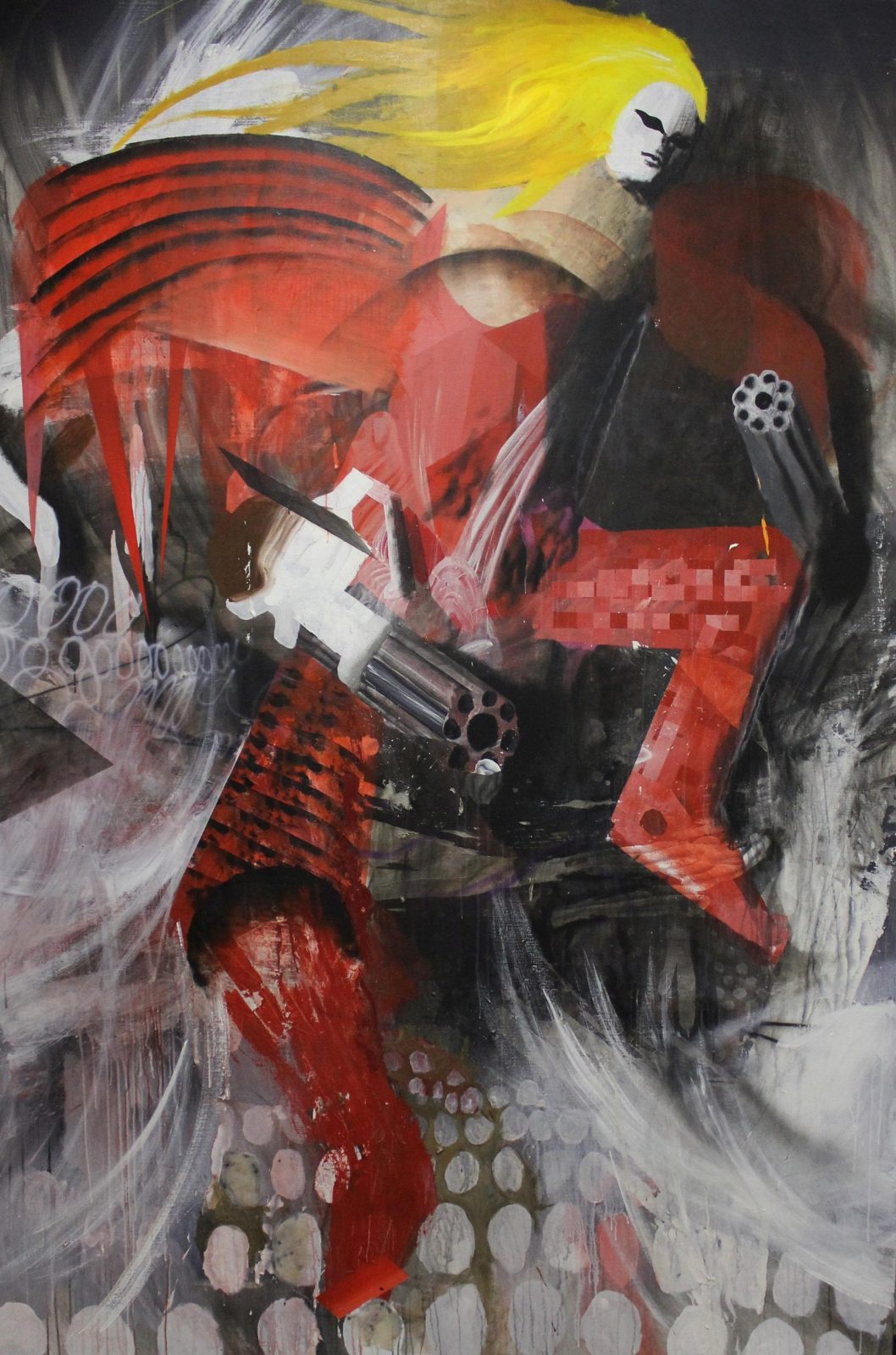 In dialogue with the digital video Work (might of young Engines) i made the same time, this painting was developed. Both media types have their own strengths and are interdependent.